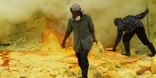 The Kawah Ijen Volcano, East Java, Indonesia. Ijen is a 20 kilometers wide caldera, which houses more volcanoes in it. One of them is the Kawah Ijen volcano, which is filled with sulfur. When it burns the blue flames appear – the site is especially amazing at night.